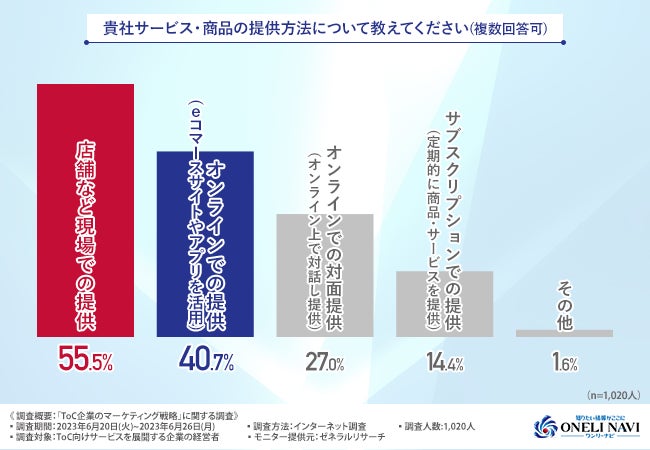 「貴社サービス・商品の提供方法について教えてください(複数回答可)」と質問したところ、『店舗など現場での提供(55.5%)』と回答した方が最も多く、次いで『オンラインでの提供(eコマースサイトやアプリを活用)(40.7%)』『オンラインでの対面提供(オンライン上で対話し提供)(27.0%)』『サブスクリプションでの提供(定期的に商品・サービスを提供)(14.4%)』と続きました。