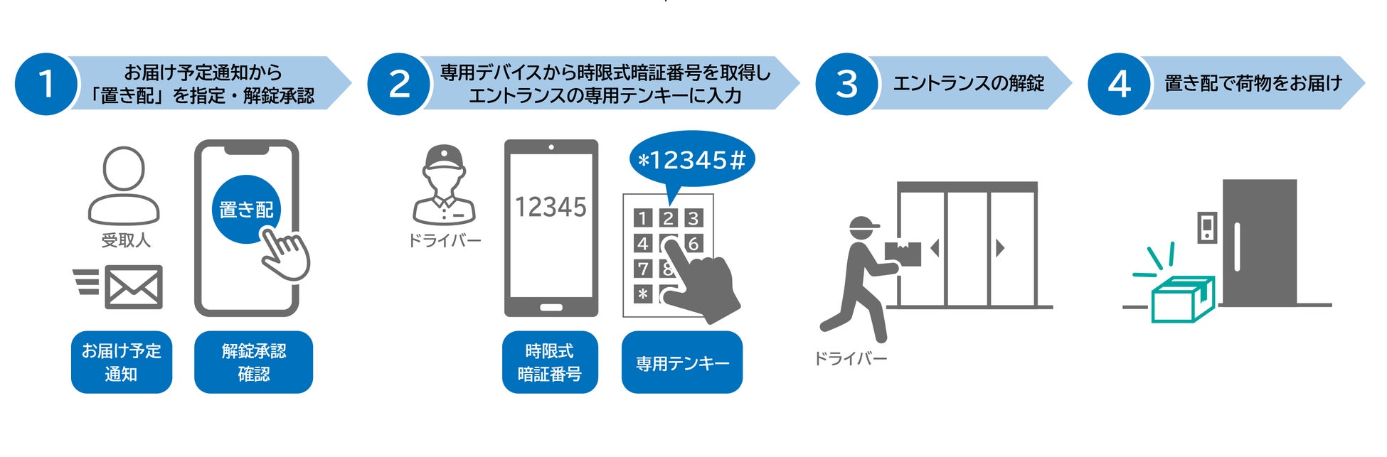 これにより対象となるマンションでは、オートロック式のエントランスであっても、事前に居住者が解錠承認を行った場合には、配送ドライバーはオートロックを時限式暗証番号で解錠し、各住戸の玄関前へ置き配を行うことができるようになりました。※3