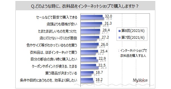 衣料品をインターネットショップで購入する人に、どのような時にインターネットショップで購入するかを聞きました(複数回答)。