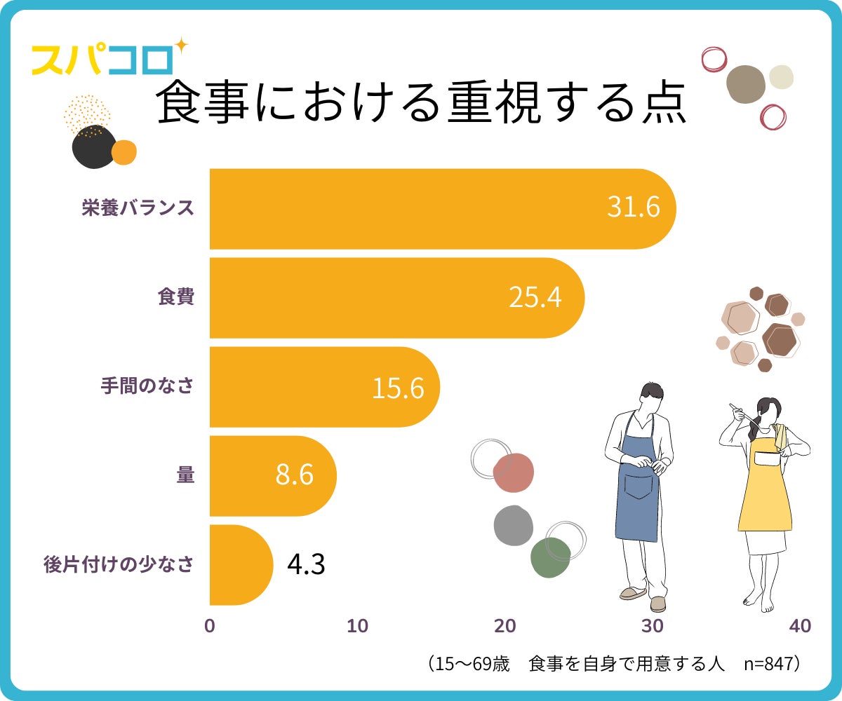 - 食事を用意する際の重視点TOP5は「栄養バランス」(31.6%)、「食費」(25.4%)、「手間のなさ」(15.6%)、「量」(8.6%)、「後片付けの少なさ」(4.3%)。