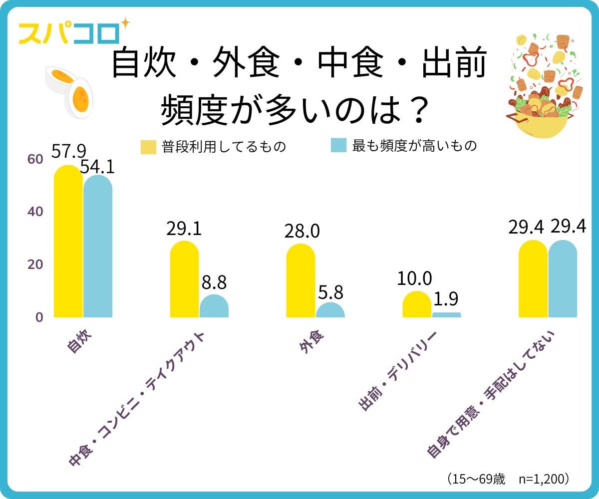 - 普段の食事は「自炊」(57.9%)、「自身で用意・手配はしてない」(29.4%)、「中食・コンビニ・テイクアウト」(29.1%)、「外食」(28.0%)、「出前・デリバリー」(10.0%)。