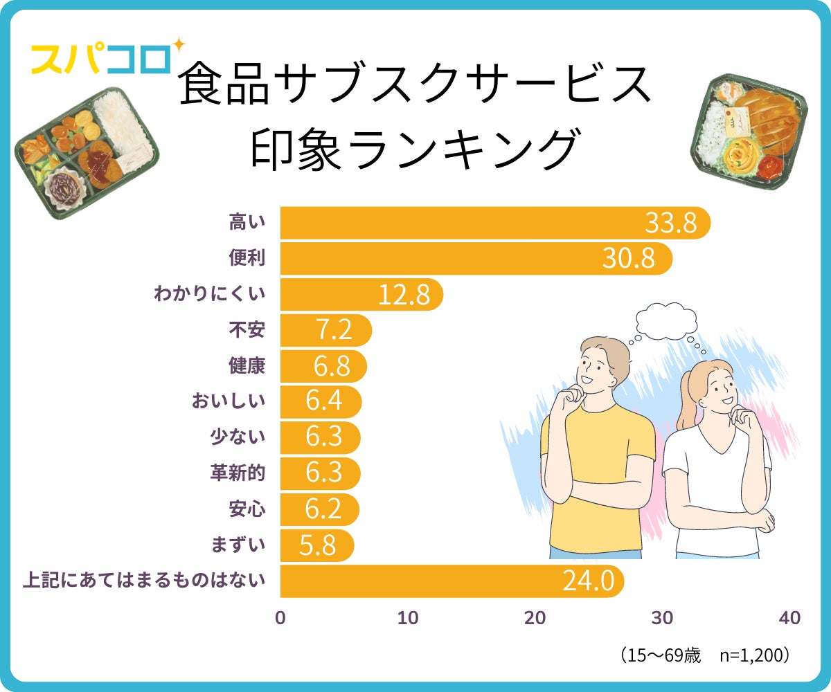 - 食品サブスクサービスの印象TOP3は「高い」(33.8%)、「便利」(30.8%)、「わかりにくい」(12.8%)。