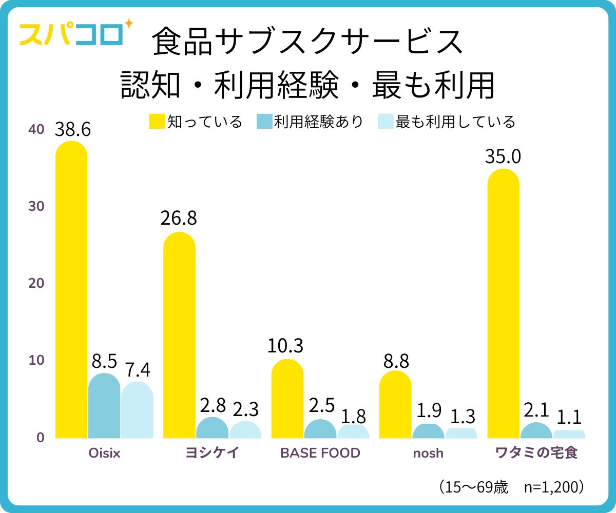 最も利用されている食品サブスクサービス上位5つは「Oisix」、「ヨシケイ」、「BASE FOOD」、「nosh」、「ワタミの宅食」でした。それぞれ認知・利用経験・最も利用している割合を見ると、認知率は「Oisix」(38.6%)、「ワタミの宅食」(35.0%)、「ヨシケイ」(26.8%)、「BASE FOOD」(10.3%)、「nosh」(8.8%)でした。 利用経験は「Oisix」(8.5%)、「ヨシケイ」(2.8%)、「BASE FOOD」(2.5%)、「ワタミの宅食」(2.1%)、「nosh」(1.9%)でした。 最も利用率は「Oisix」(7.4%)、「ヨシケイ」(2.3%)、「BASE FOOD」(1.8%)、「nosh」(1.3%)、「ワタミの宅食」(1.1%)でした。