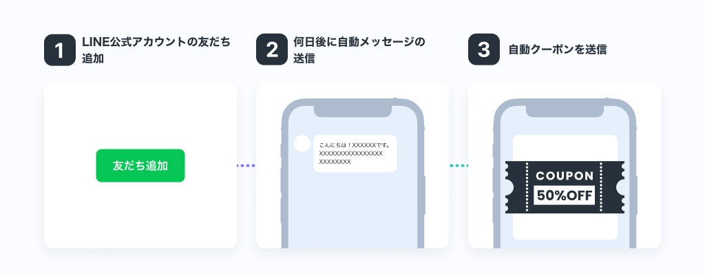 「LINE公式アカウントの友だち追加」をトリガーとしたメッセージ/クーポンの自動配信を行うことができます。これにより、LINE公式アカウントを友達追加後、特定の日数を経過したユーザーに対して自動的に任意のアクションを実行することができるため、ユーザーの関心が高いタイミングで商品や企業の情報提供を通した購買の促進が可能となります。