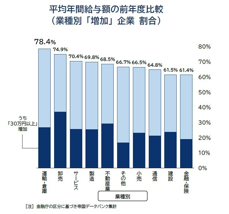 業種別にみると、前年度から平均給与額が増加した上場企業が多かったのは「運輸・倉庫」の78.4%だった。需要が回復している空運・海運業や、人手不足に伴うトラック運転手の賃金上昇が続く陸運業などで平均給与額の増加が相次いだ。「卸売」や「サービス」でも7割以上の企業で平均給与額が増加した。