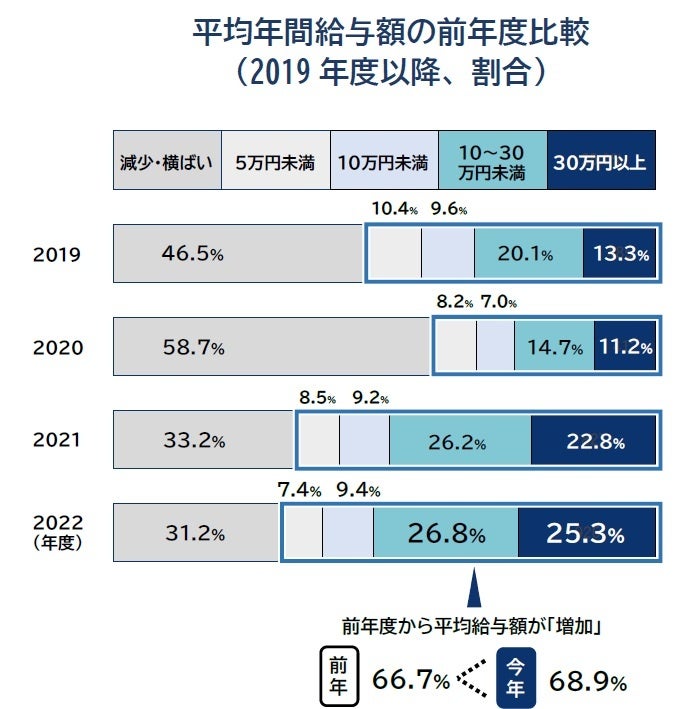 2021-22年度の増減を比較すると、前年度から平均給与額が「増加」した上場企業は68.9%を占めた。21年度時点の66.7%から拡大し、上場企業でも賃上げの動きが広がった。特に、前年度から「30万円以上」増加の割合は25.3%と、全上場企業の4社に1社で大幅な賃上げとなったほか、比較可能な04年度以降で最高だった。輸出企業を中心に円安の追い風を受けて好業績となった企業が多かったほか、物価高や人手不足を背景とした賃上げ機運が22年度以降急速に高まったことを背景に、上場企業の平均給与額は近年上昇傾向にある。