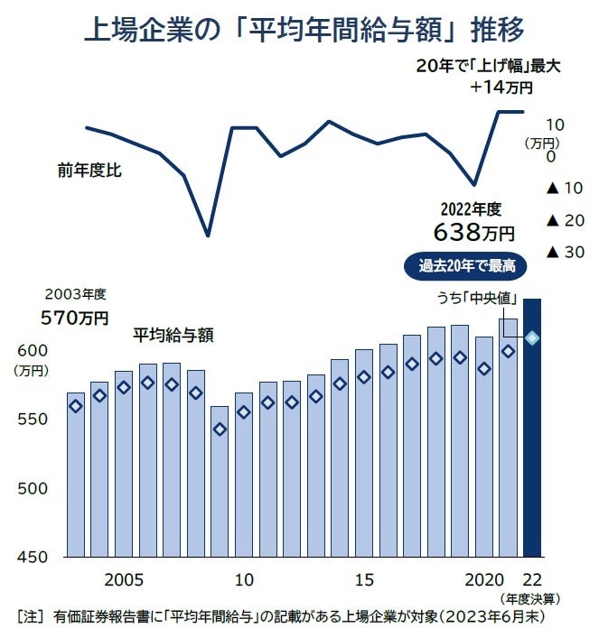 - 上場企業の22年度平均給与は638万円、過去20年で最高額