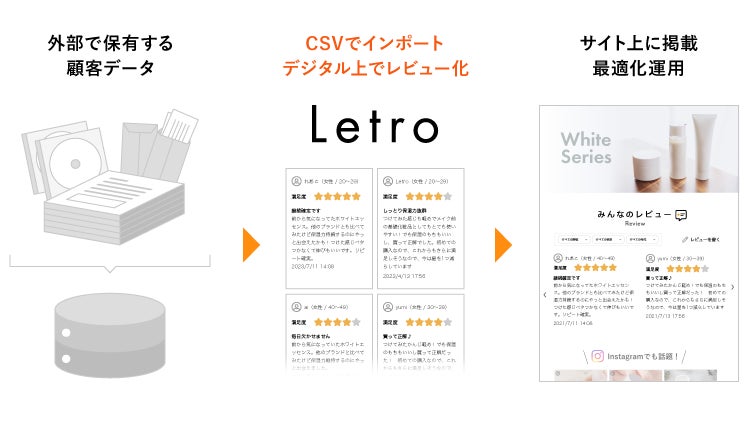 顧客データインポート機能は、オフラインの顧客データをはじめとするLetro外部のデータをインポートできる機能です。顧客データを一括管理できるだけでなく、Letroを活用してデジタル上でレビュー化し、サイト上へ掲載・最適化運用が可能となります。