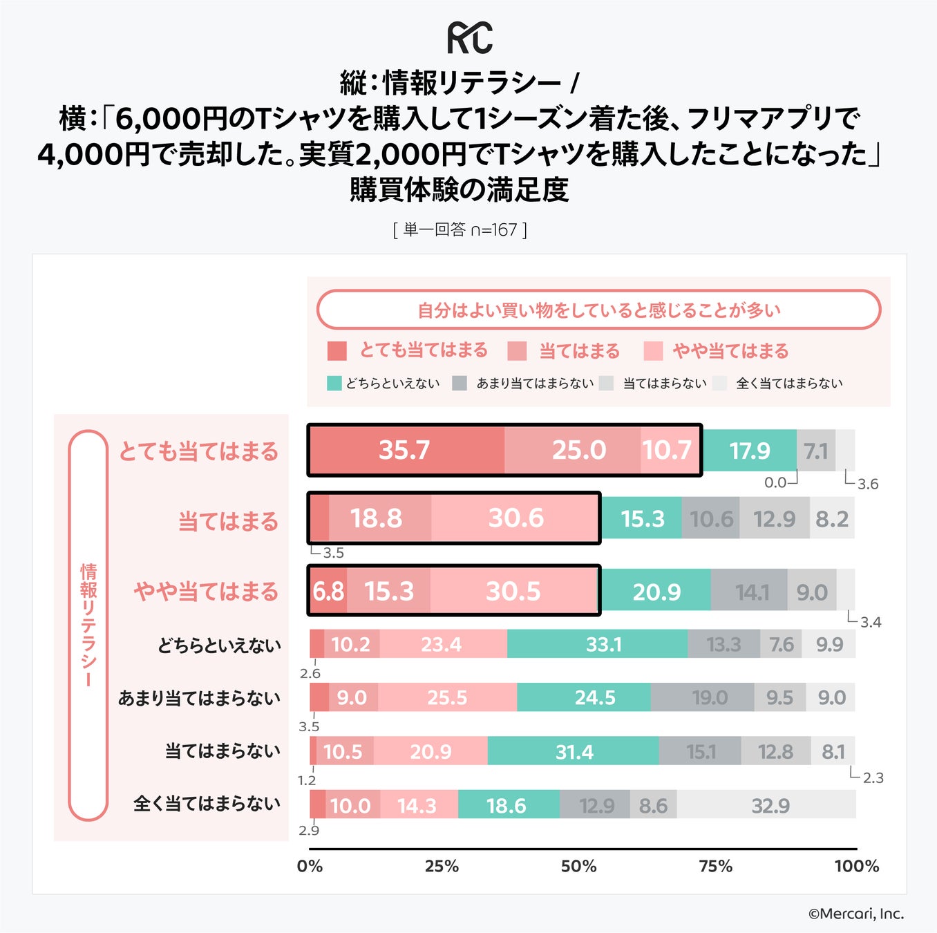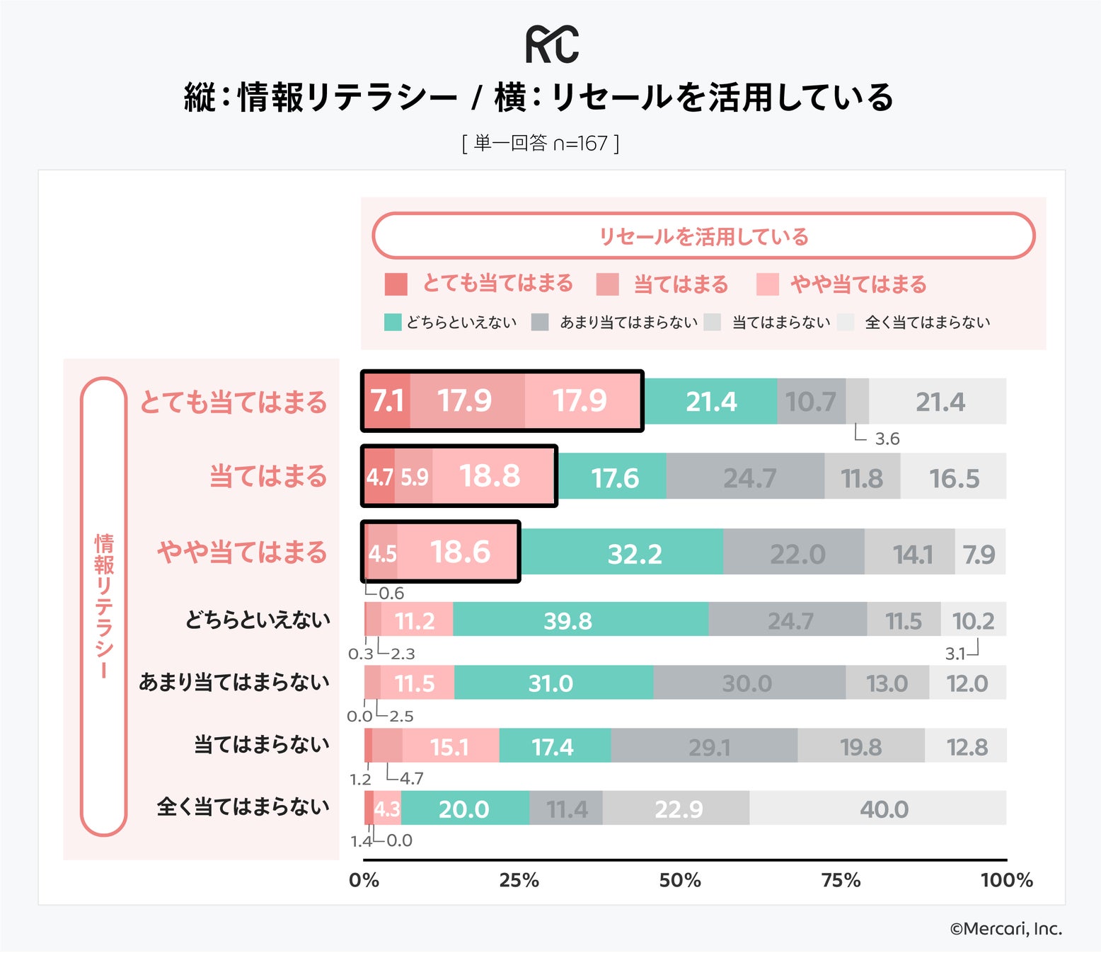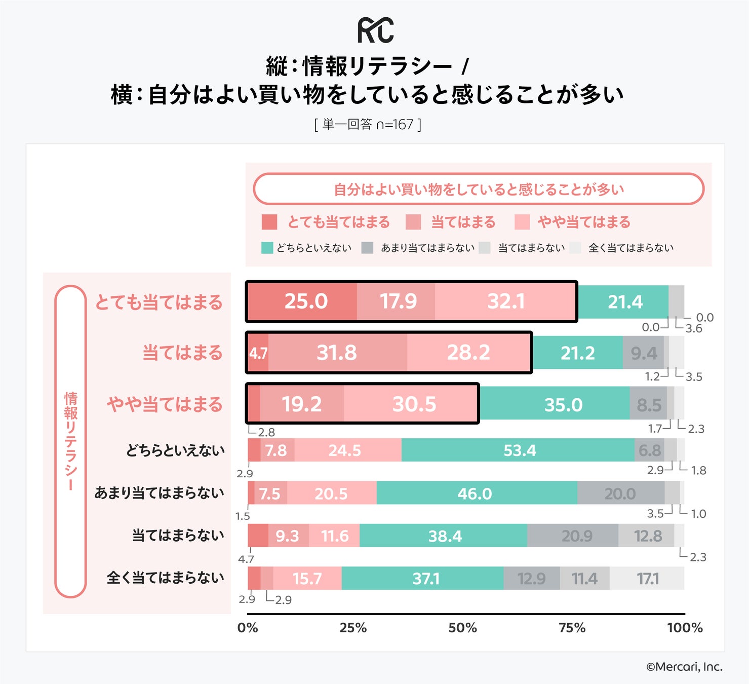 「情報リテラシーが高い」と回答した人は、そうではない人と比べて、「セール品やアウトレット品を主に買い、定価ではほぼ買わない」「リユース品やレンタル品を活用している」「自分はよい買い物をしていると感じることが多い」の回答する割合が高い。また、リセールバリューを意識した買い物への満足度が高い傾向も明らかに。情報を収集・取捨選択することで、“定価で買う”以外にもリユース・レンタル品を活用するなど、“所有”“利用”に多様な選択肢があることから、自らの買い物に対する満足度も高いことが伺える。