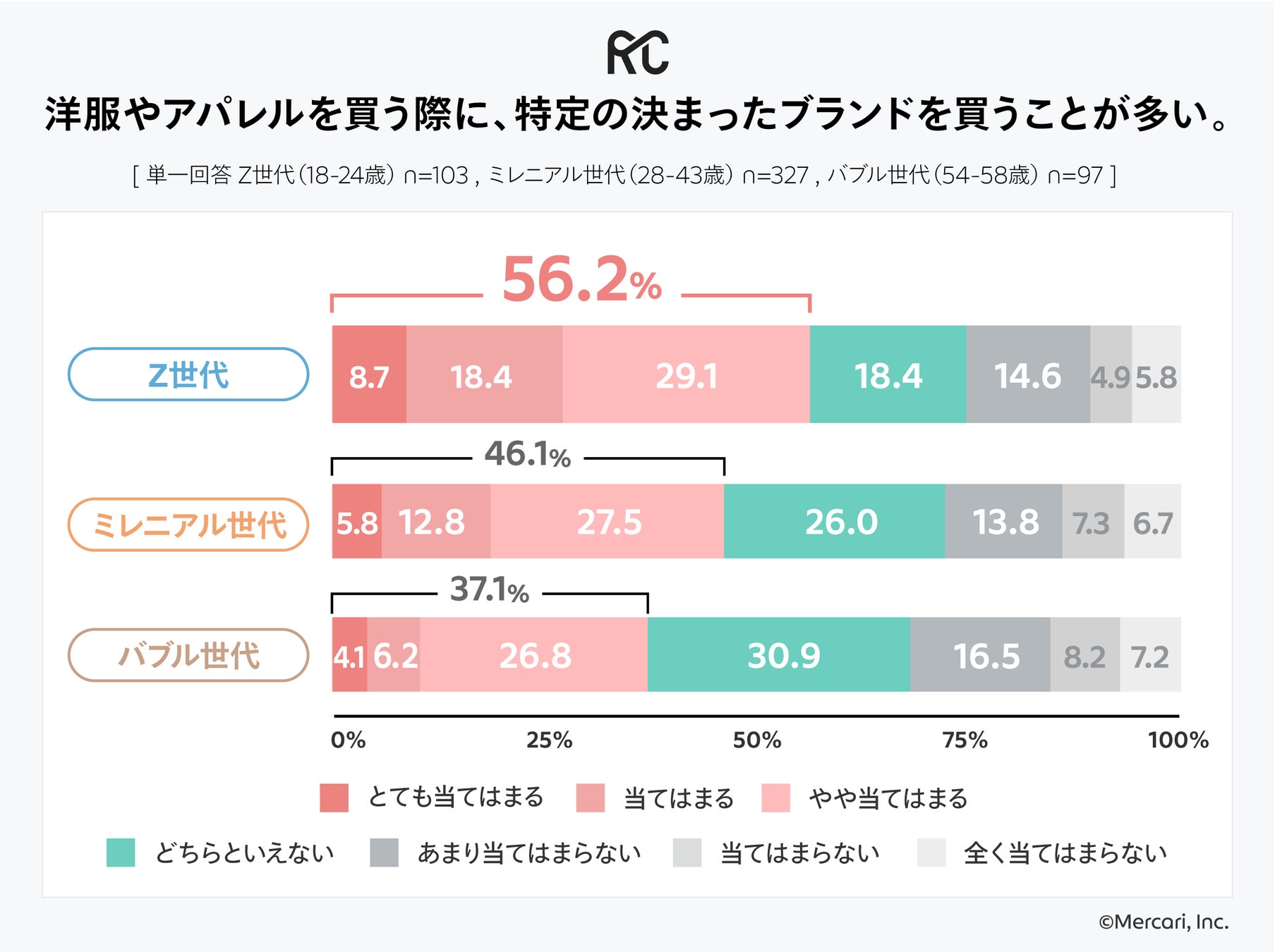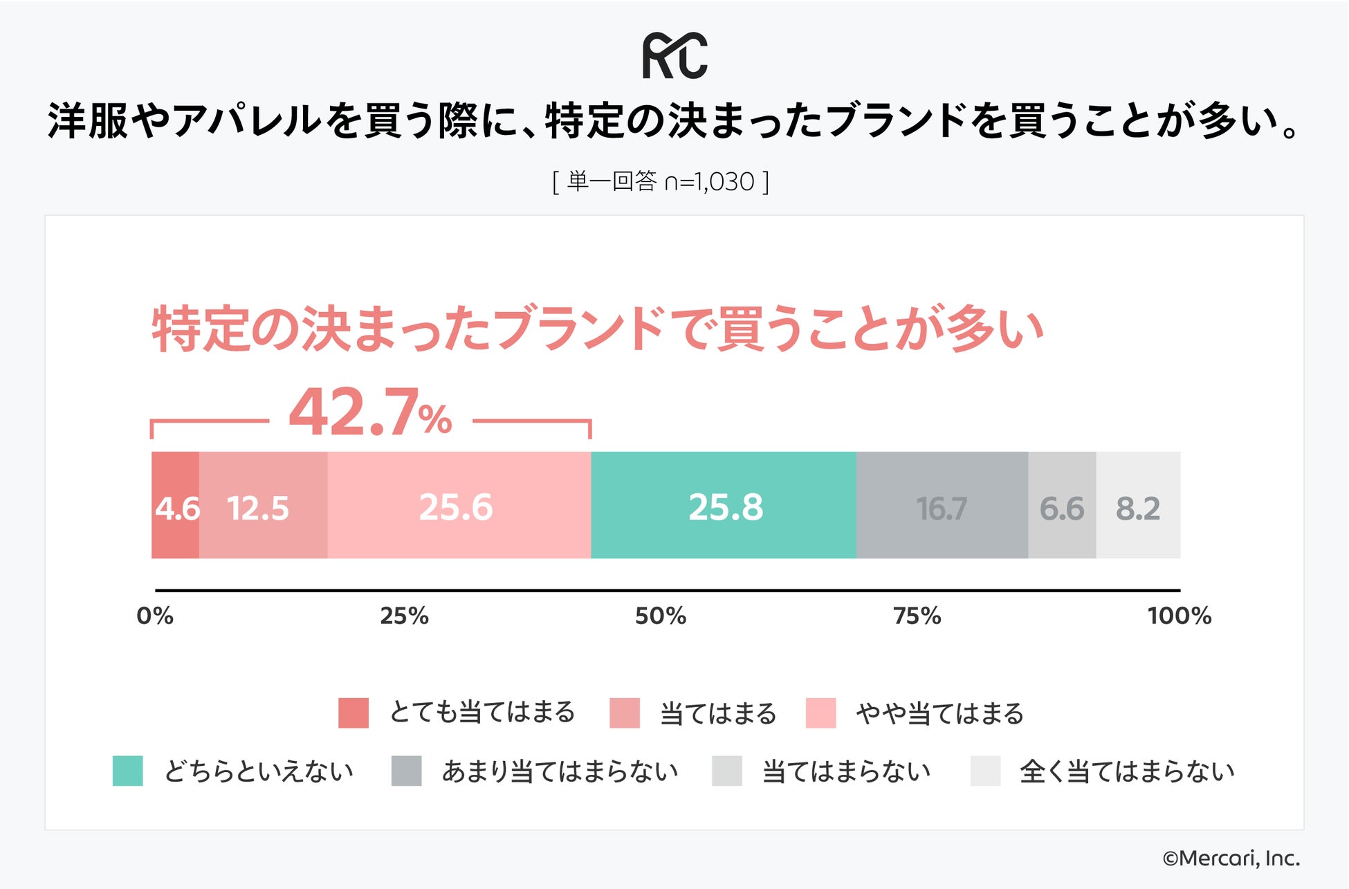 42.7%が「特定の決まったブランドで買うことが多い」と回答。世代別では、Z世代が最多の56.2%と、Z世代は“失敗しない消費”を求める傾向からか、特定のブランドから購入する傾向が伺えた。