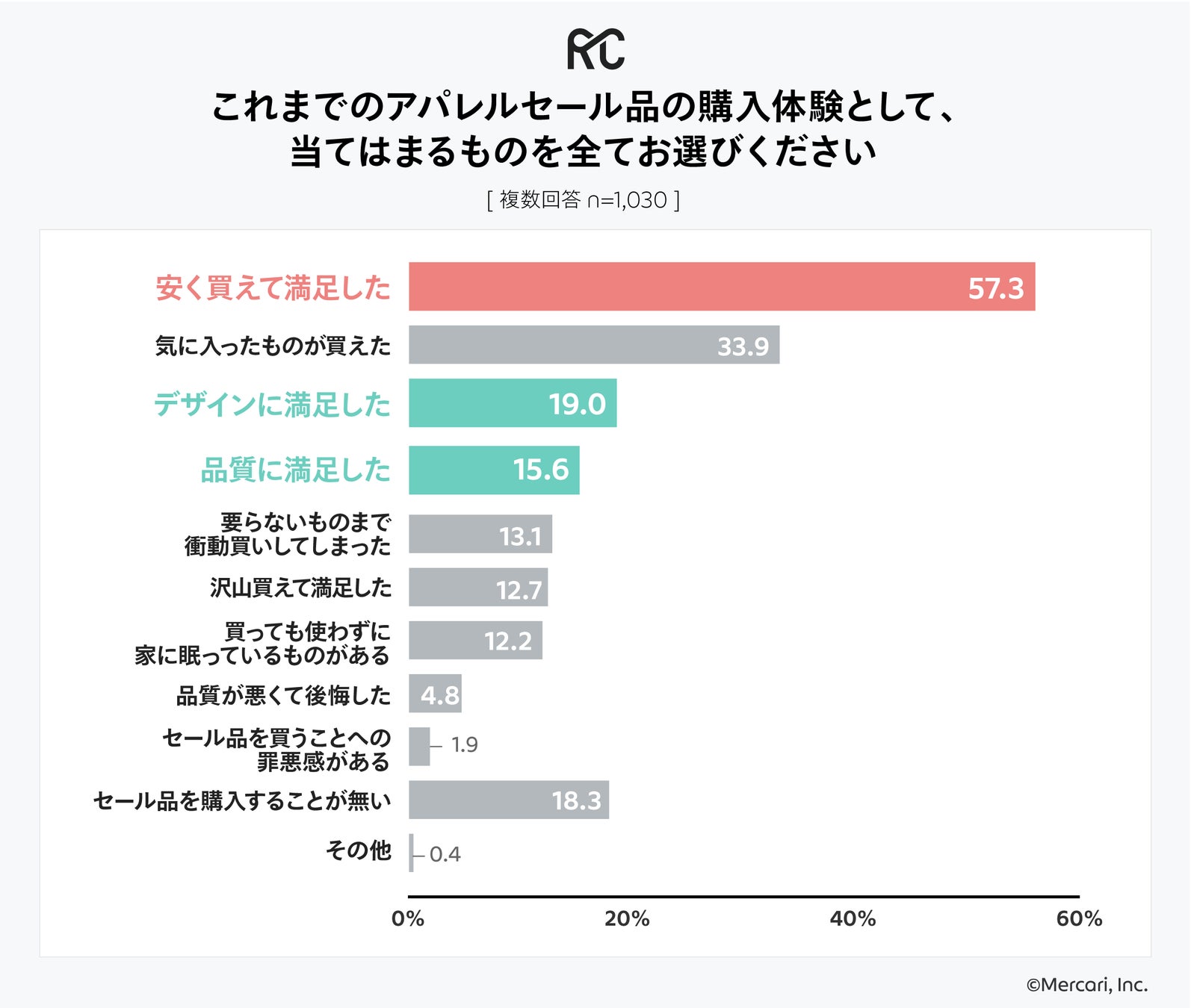 セール品を購入した際の意識は「安く買えて満足した」が57.3%で最多である一方、「デザインに満足した」19.0%、「品質に満足した」15.6%と回答割合は2割未満に。 セールは価格への満足度が高いものの、品質やデザインに対する満足度が低い傾向が伺えた。