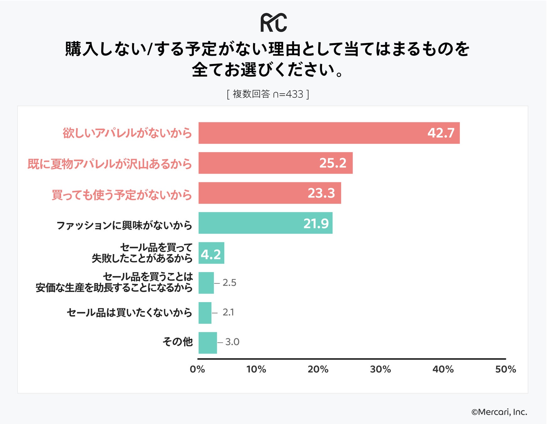 サマーセールを「利用しない/利用する予定がない」理由TOP3は、1位「欲しいアパレルがないから」2位「既に夏物アパレルが沢山あるから」3位「買っても使う予定がないから」。
