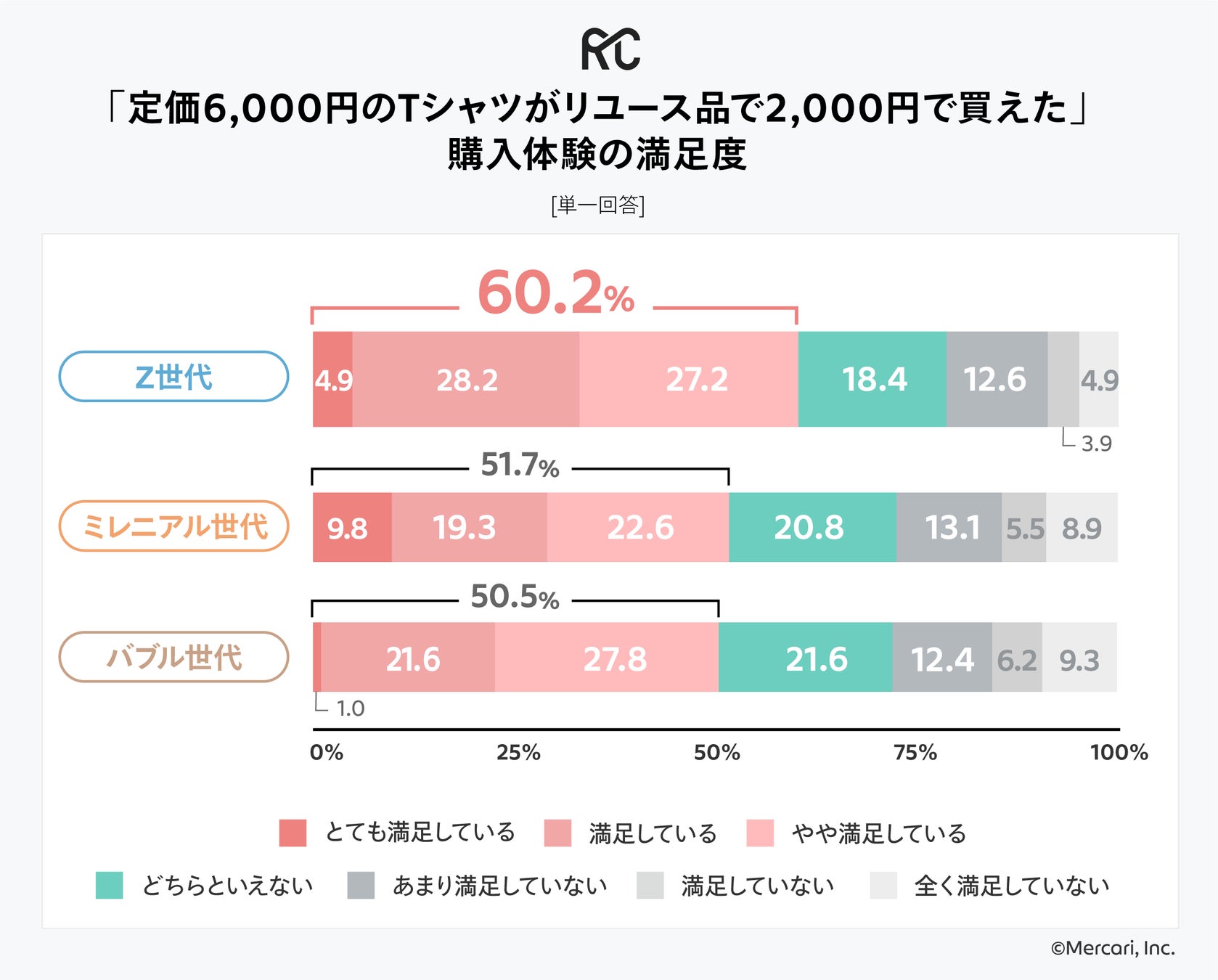 リユースを活用した、「2. 6,000円のTシャツを購入して1シーズン着た後、フリマアプリで4,000円で売却し、実質2,000円でTシャツを購入したことになった」、「3. 定価6,000円のTシャツがリユース品で2,000円で買えた」の体験ではいずれもZ世代の満足度が最も高く、それぞれ61.2%、60.2%という結果に。