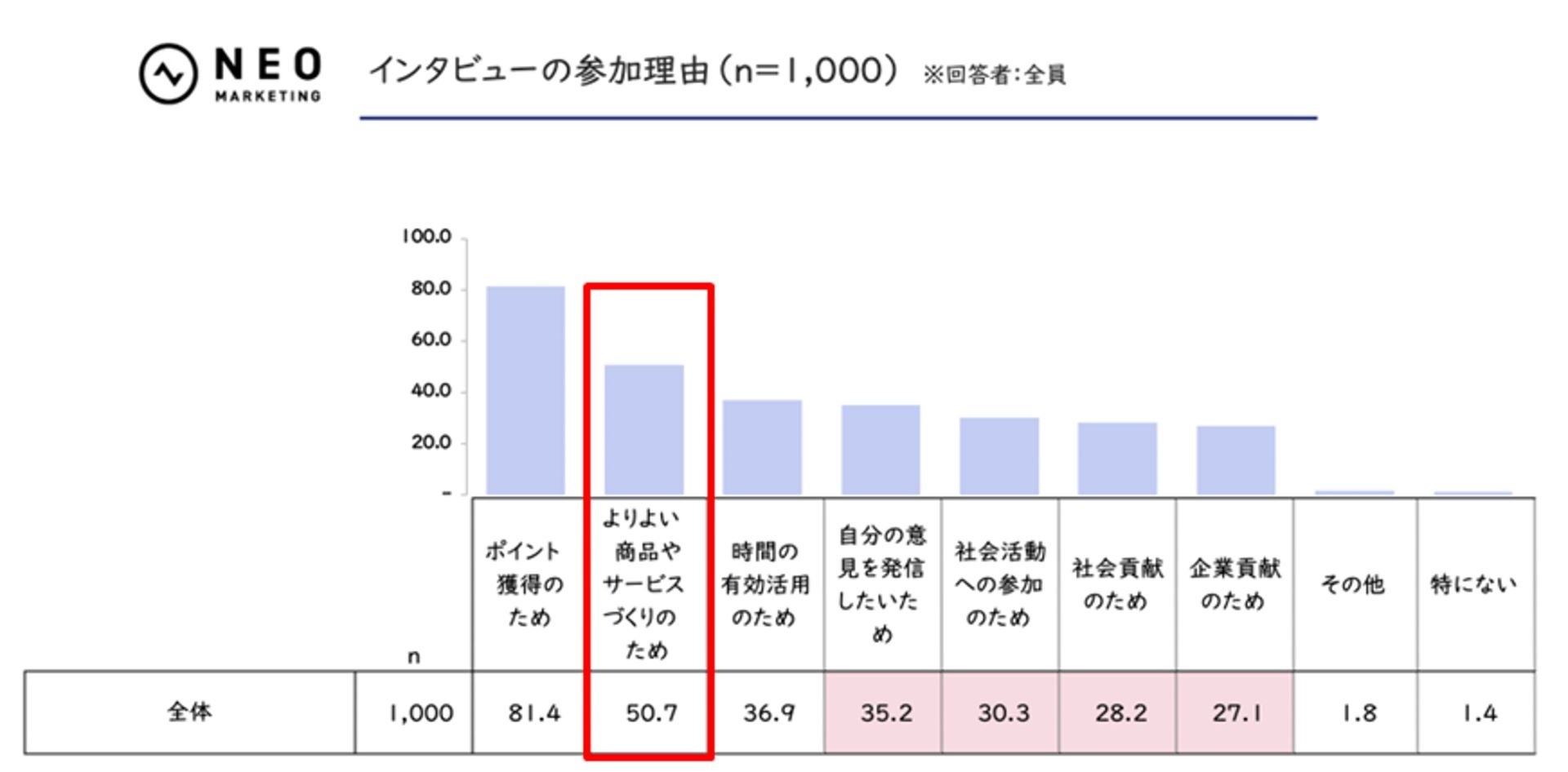 80%以上が「ポイント獲得」を参加理由としているものの、50.7%と約半数が「よりよい商品やサービスづくりのため」を思って参加していることがわかりました。