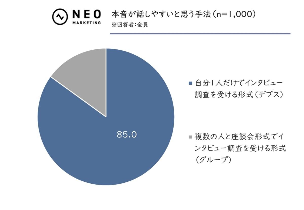 デプスインタビューの場合、自分の発言が検討違いじゃないか気にしたり、考えを綺麗にまとめてから話さないといけない、というプレッシャーを感じたりせずに済むため「本音が話しやすい」と感じるよう。