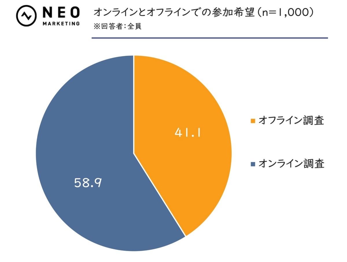 オンラインとオフラインでの調査のうち、機会があれば参加したいと思うのはどちらかお聞きしました。