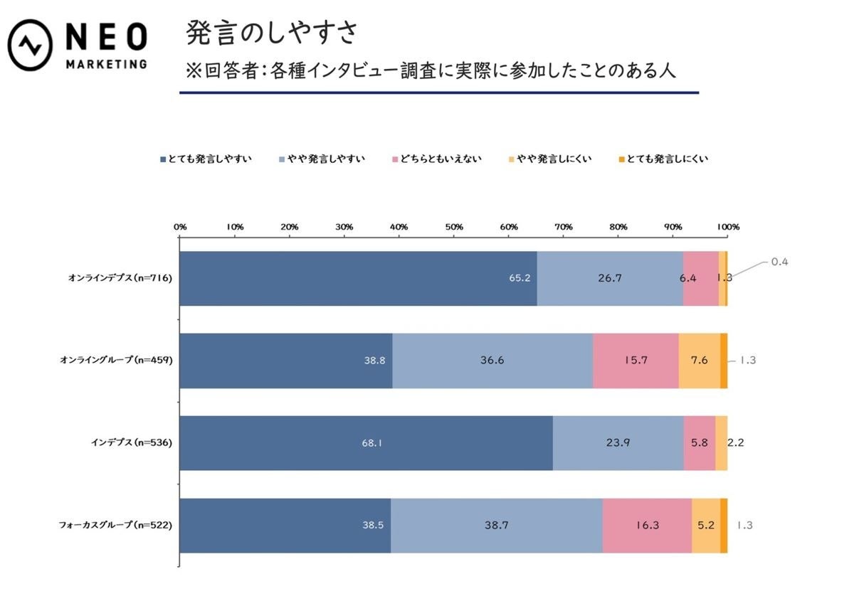 グループインタビューの発言のしやすさはデプスインタビューよりも10ポイント以上下がるものの、オンラインかオフラインかにかかわらず、70%以上が発言しやすいと回答。