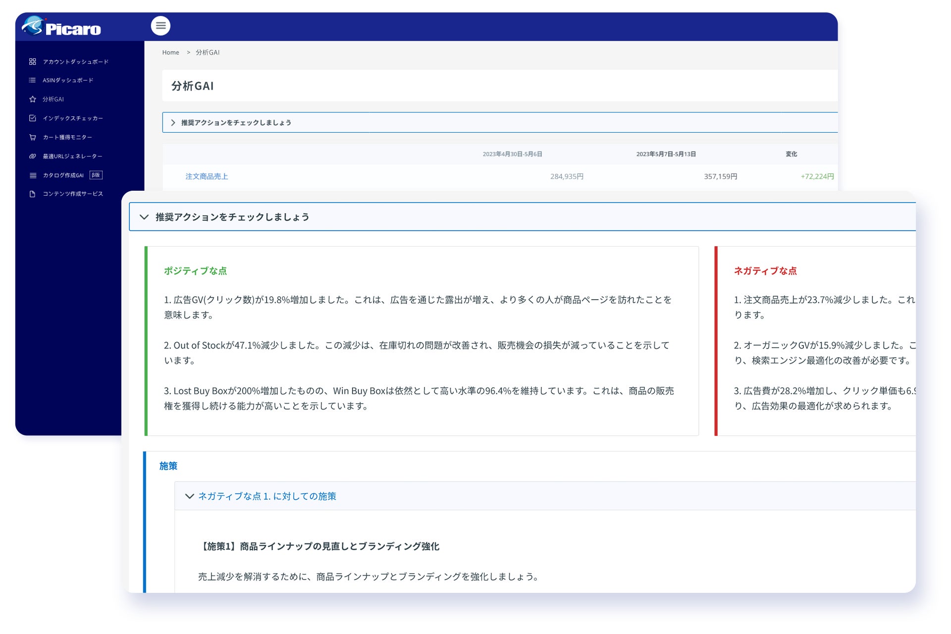 株式会社Picaro.AI(本社:神奈川県藤沢市、代表取締役:下平 季位)は、アマゾン売上拡大支援ツール「Picaro.AI(ピカロドットエーアイ)」の「分析GAI※」に、ChatGPTを搭載した新機能「推奨アクションGAI(β)」を追加しました。