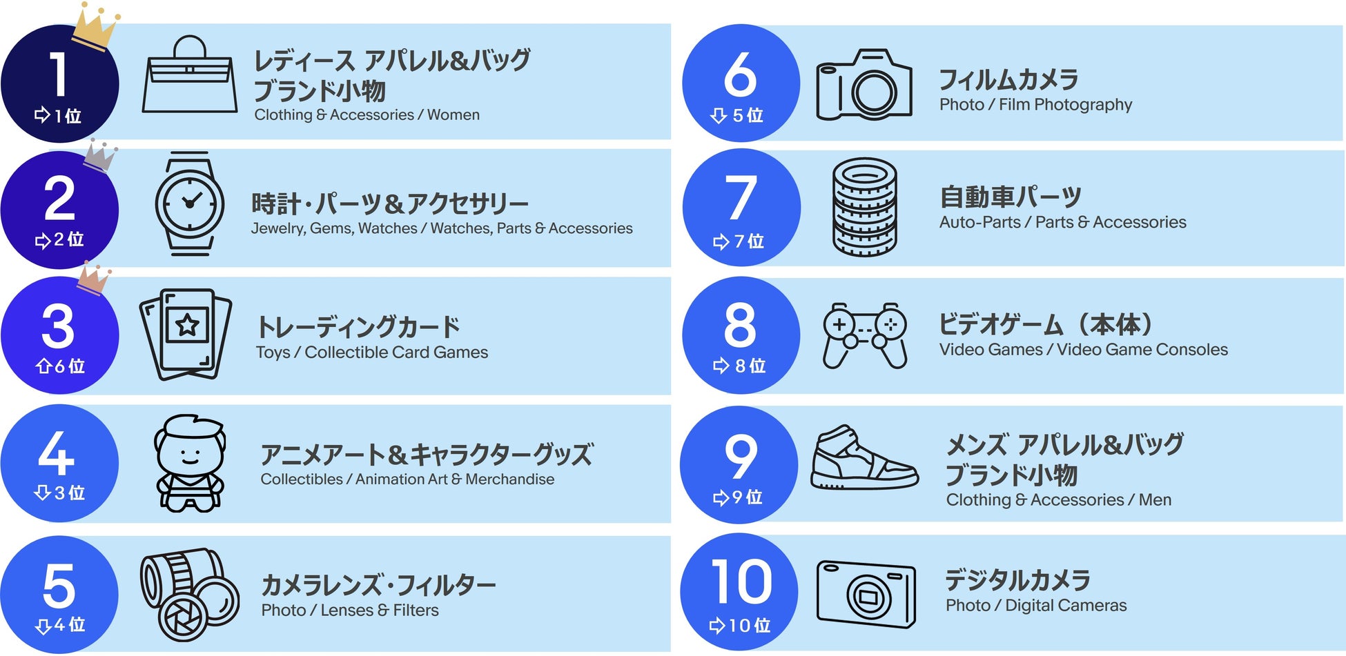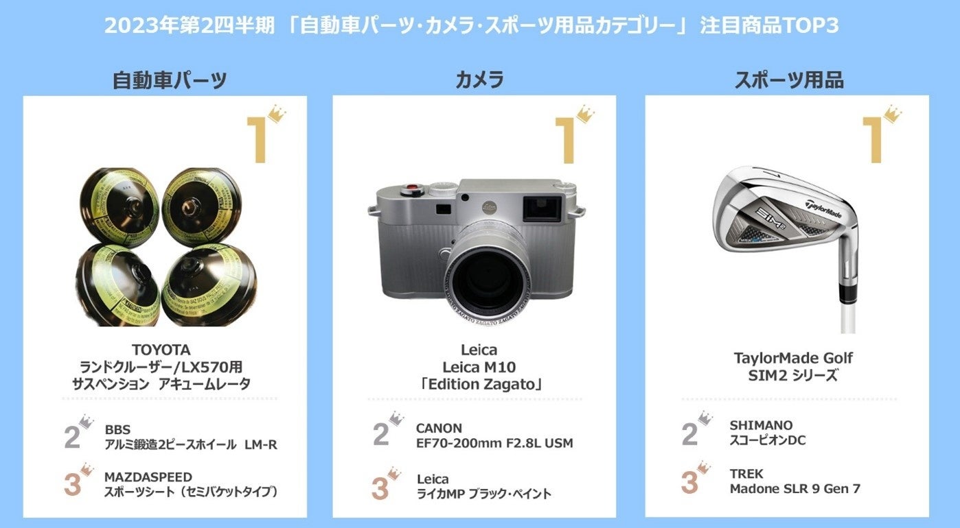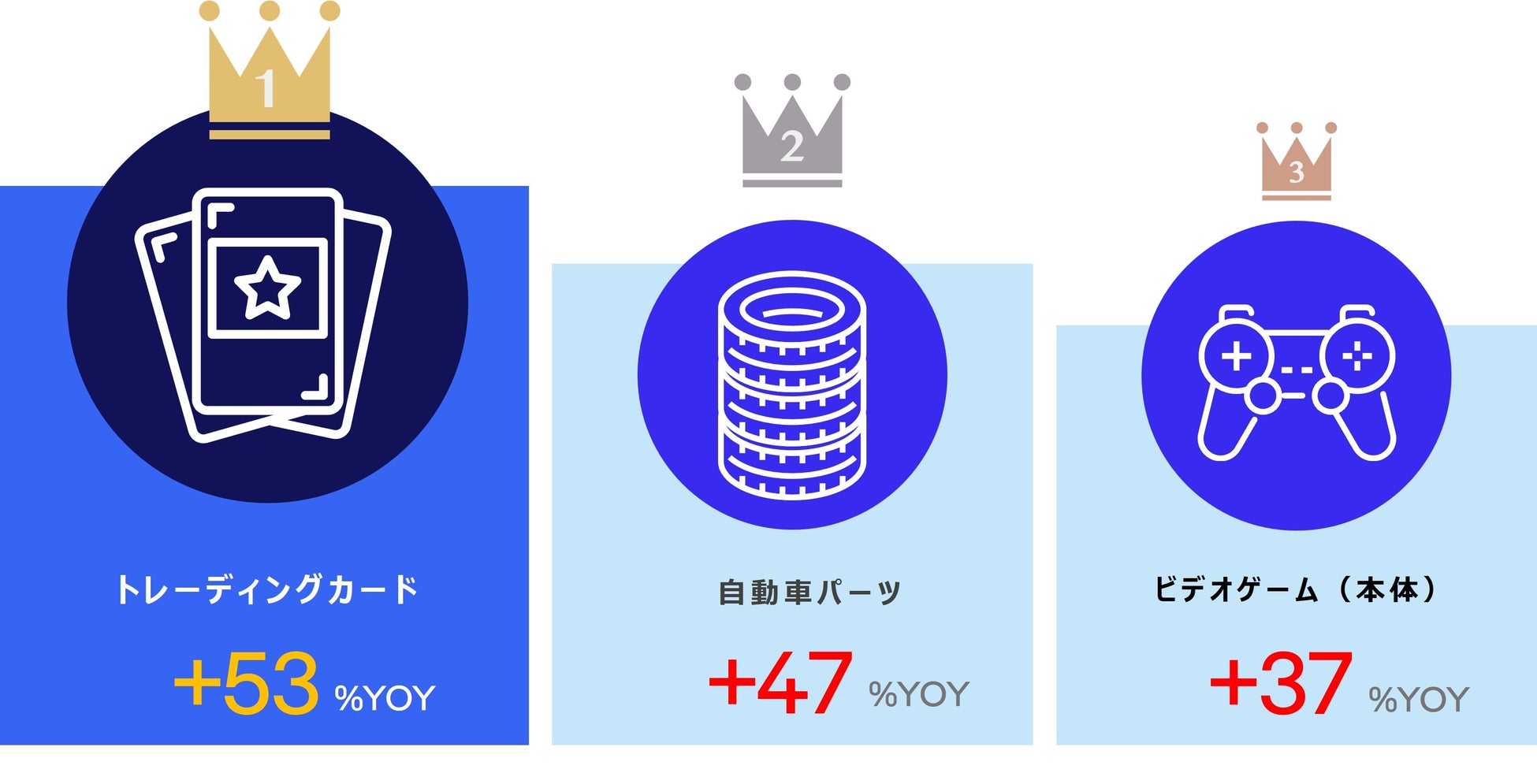 さらに、日本車人気の高まりで昨年から3期連続で成長率TOP3入りの成長を続けている自動車パーツやレトロゲームの人気によるビデオゲーム機本体の売上も引き続き伸びているほか、昨年から急成長していたデジタルカメラやスニーカーも市場が順調に推移しており新たな人気カテゴリーの定番となりそうです。