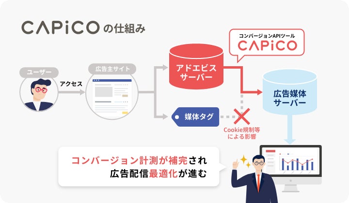 このような状況を受け、より多くの企業にコンバージョンAPIをカンタンにご活用いただくため、「CAPiCO」を開発いたしました。「CAPiCO」のご活用により、Cookie規制下における正確なデータ計測と広告運用の最適化を支援し、マーケティングによる企業の収益拡大に貢献してまいります。