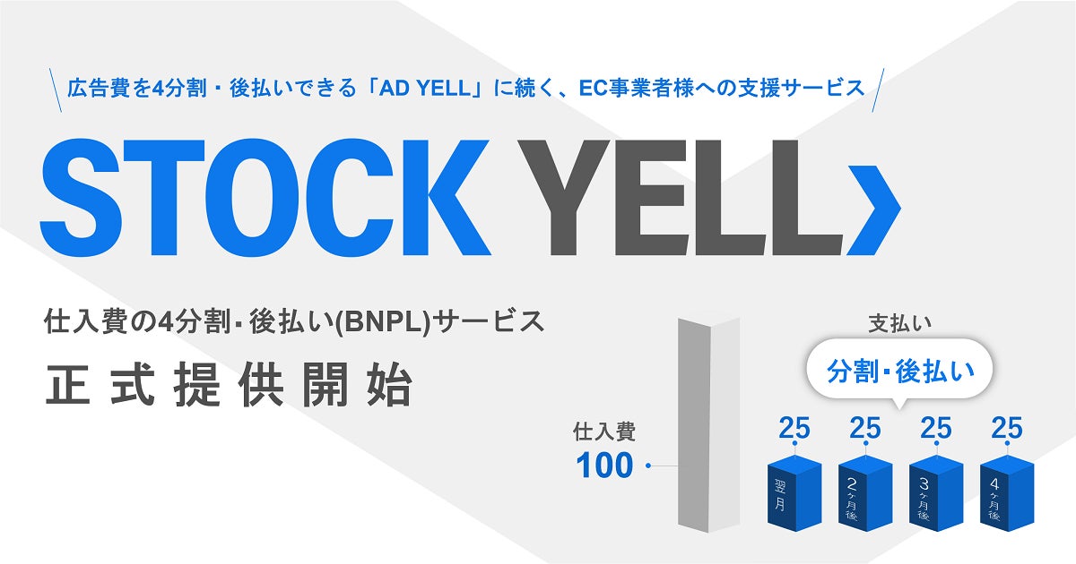 「新たな金融のカタチを創り出す」をミッションに掲げる株式会社バンカブル(本社:東京都千代田区、代表取締役社長:髙瀬 大輔、以下、バンカブル)は、EC市場における同業者間の競争や顧客ニーズの多様化などによる厳しい事業環境に対応し、「キャッシュアウトの先行により、新たな投資ができない」というEC事業者様の課題解決を目的に、仕入費の4分割・後払い(BNPL※1)サービス「STOCK YELL(ストックエール)」を、2023年7月31日(月)より正式提供開始することを、お知らせいたします。