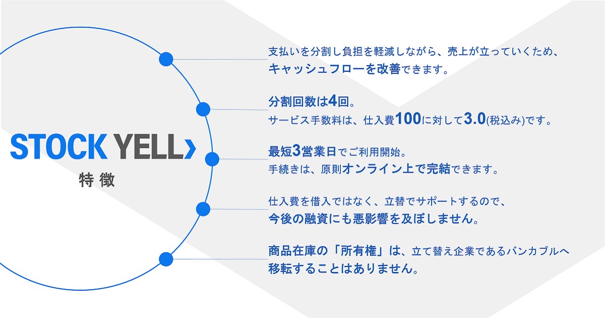 「STOCK YELL」は、商品の仕入れにかかる費用を最大4回に分割・後払いにできるサービスです。事業成長へアクセルを踏み込むためには必要不可欠であるにも関わらず、金融機関からは「融資を受けにくい、商品在庫の仕入費」に対して、消費財・コスメ・家具などのプライベートブランドやOEMを手掛けるEC事業者様を中心にご活用いただけます。これまで一括で支払うことにより、金額としての負担も大きい仕入費によるキャッシュアウトのタイミングを分散化し、負担を軽減できます。