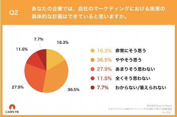 「Q2.あなたの企業では、自社のマーケティングにおける施策の具体的な計画はできていると思いますか。」(n=104)と質問したところ、「あまりそう思わない」が27.9%、「全くそう思わない」が11.5%という回答となりました。