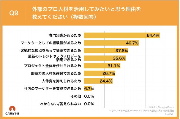 Q8で「非常にそう思う」「ややそう思う」と回答された方に、「Q9.外部のプロ人材を活用してみたいと思う理由を教えてください(複数回答)」(n=45)と質問したところ、「専門知識があるため」が64.4%、「マーケターとしての経験値があるため」が46.7%、「客観的な視点をもって提案できるため」が37.8%という回答となりました。
