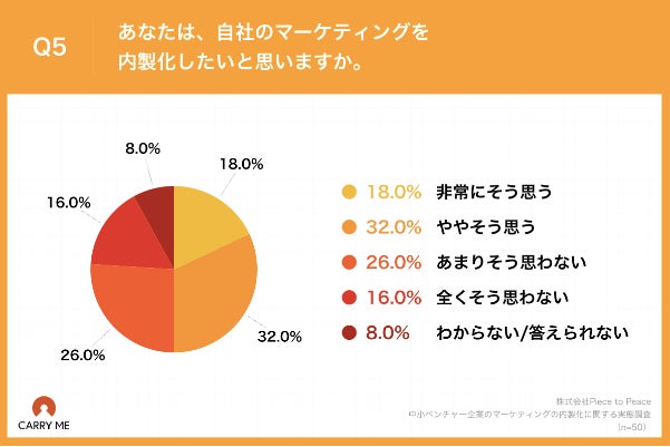 Q1で「全て外注している」「一部外注している」「そもそもしていない」と回答した方に、「Q5.あなたは、自社のマーケティングを内製化したいと思いますか。」(n=50)と質問したところ、「非常にそう思う」が18.0%、「ややそう思う」が32.0%という回答となりました。