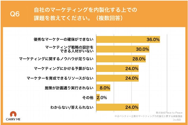 Q1で「全て外注している」「一部外注している」「そもそもしていない」と回答した方に、「Q6.自社のマーケティングを内製化する上での課題を教えてください。(複数回答)」(n=50)と質問したところ、「優秀なマーケターの確保ができない」が36.0%、「マーケティング戦略の設計をできる人材がいない」が30.0%、「マーケティングに関するノウハウが足りない」が28.0%という回答となりました。