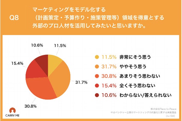 「Q8.マーケティングをモデル化する(計画策定・予算作り・施策管理等)領域を得意とする外部のプロ人材を活用してみたいと思いますか。」(n=104)と質問したところ、「非常にそう思う」が11.5%、「ややそう思う」が31.7%という回答となりました。