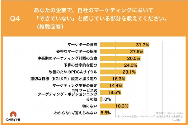 「Q4.あなたの企業で、自社のマーケティングにおいて「できていない」と感じている部分 を教えてください。(複数回答)」(n=104)と質問したところ、「マーケターの育成」が31.7%、「優秀なマーケターの採用」が27.9%、「中長期のマーケティング計画の立案」が26.0%という回答となりました。