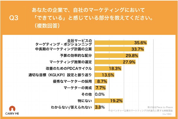 「Q3.あなたの企業で、自社のマーケティングにおいて「できている」と感じている部分を教えてください。(複数回答)」(n=104)と質問したところ、「自社サービスのターゲティング・ポジションニング」が35.6%、「中長期のマーケティング計画の立案」が33.7%、「予算の効率的な配分」が29.8%という回答となりました。