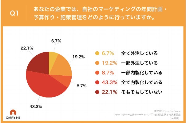 「Q1.あなたの企業では、自社のマーケティングの年間計画・予算作り・施策管理をどのように行っていますか。」(n=104)と質問したところ、「一部内製化している」が8.7%、「全て内製化している」が43.3%という回答となりました。