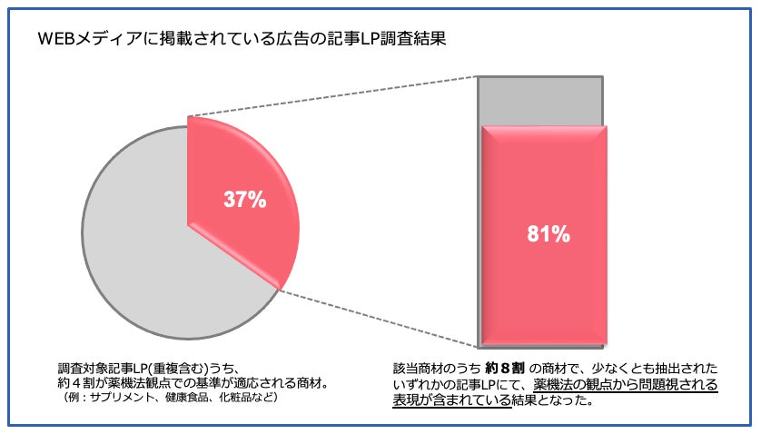 薬機法チェック事業を手がける株式会社REGAL CORE(東京都渋谷区、代表取締役社長:田之上 隼人)は、薬機法・景表法などの法令違反になり得る表現を伴う記事LP(ランディングページ)[1]の広告配信状況に関する調査を定期的に実施しています。その結果をご報告いたします。