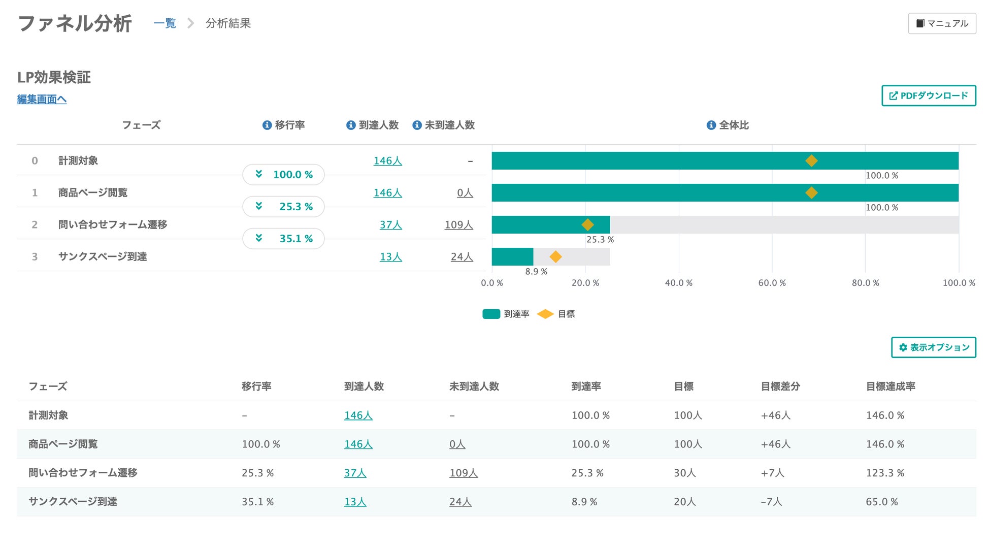 フェーズ間の推移率を測ることができ目標に対する進捗を確認することができます