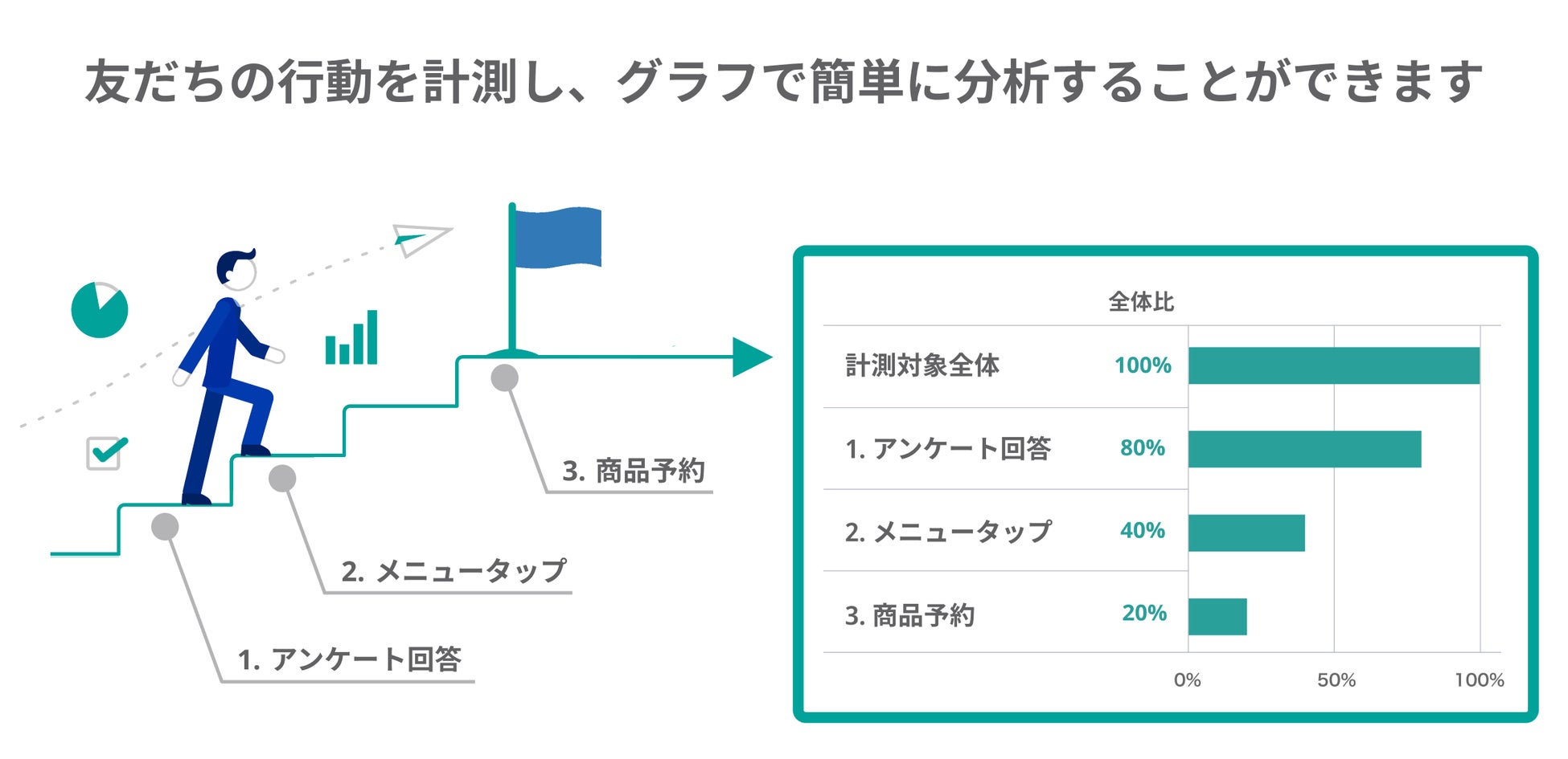 ファネル分析機能とは、LINE公式アカウントを友だち登録している顧客の行動を計測し、グラフで簡単に分析できる機能です。「アンケートに回答した」「製品を購入した」など、特定の行動をした友だちの人数や推移率を計測することで、優先的に改善すべきプロセスが明確になります。