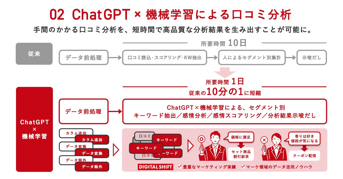 オプト社の生成AI分野におけるソリューション開発力とデジタルシフト社の豊富なマーケティング支援ノウハウの連携により、コミュニケーションシナリオの作成時間を7分の1に、商品の口コミデータ分析時間を従来の10分の1に、短縮することが可能です。