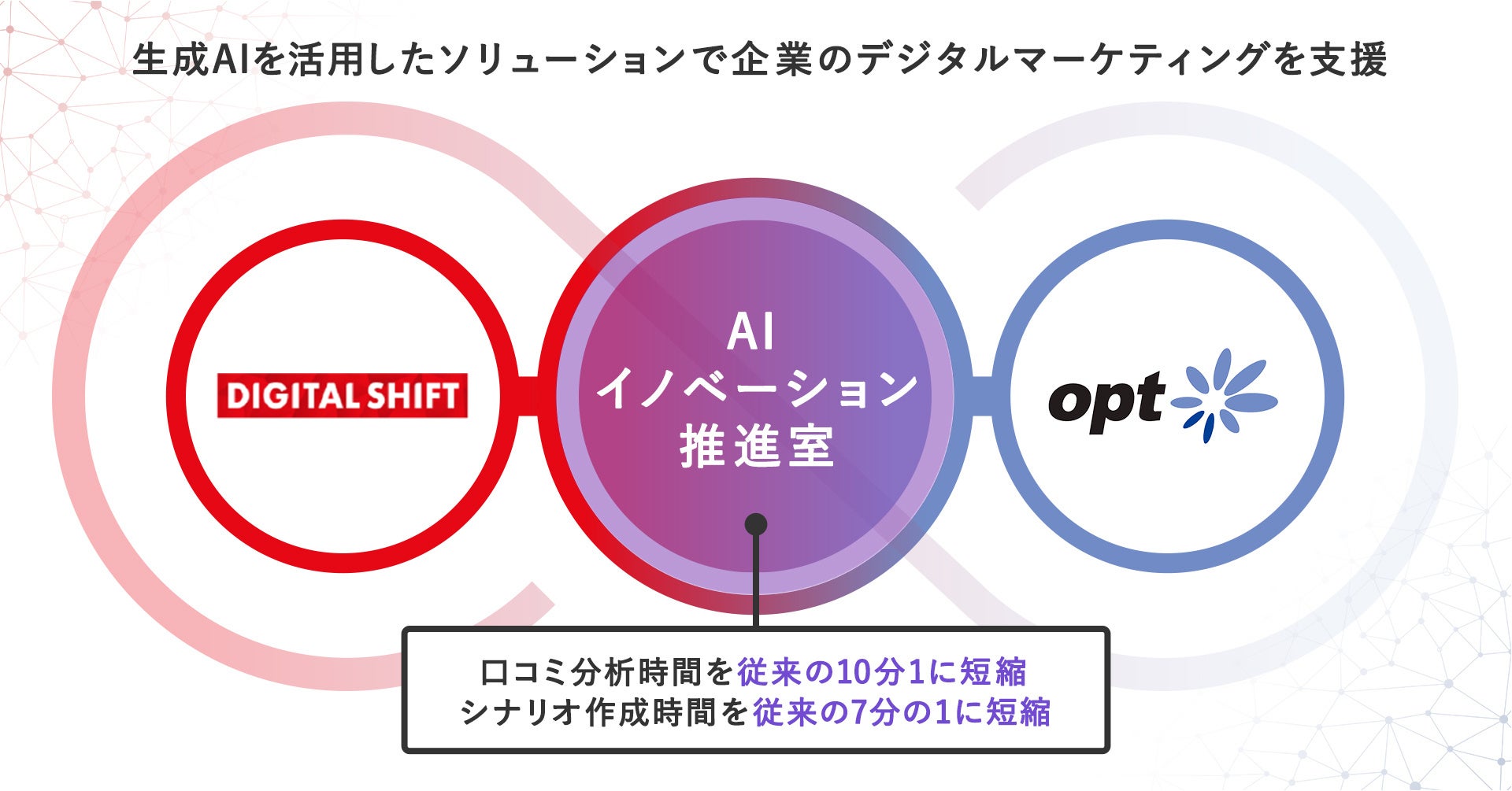 このような背景に対応するため、デジタルシフト社とオプト社は、デジタルマーケティングの領域において、生成AIを用いたソリューションの開発と専門知識を交えた生成AIの適切な運用ノウハウを提供することを目的とした「AIイノベーション推進室」を設立いたしました。急速に進化する生成AIの領域において、デジタルマーケティングへの適切な利活用を推進していきます。