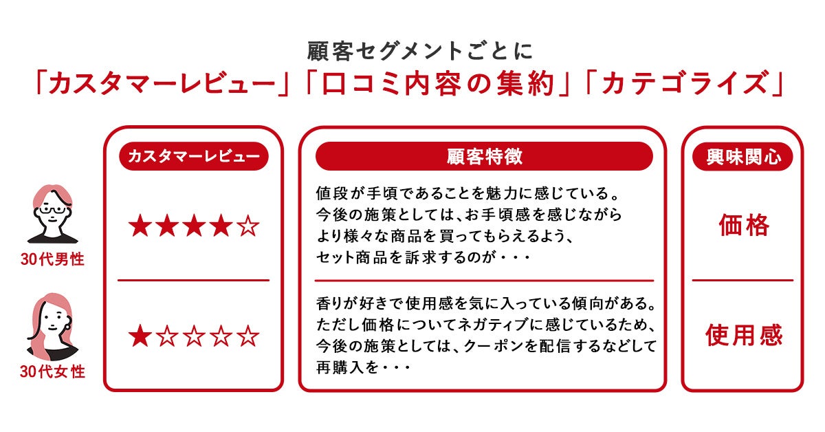ChatGPTと機械学習による口コミデータ分析です。従来の10分の1の時間に短縮してセグメント別にキーワード抽出から分析結果の示唆出しまでが可能です。
