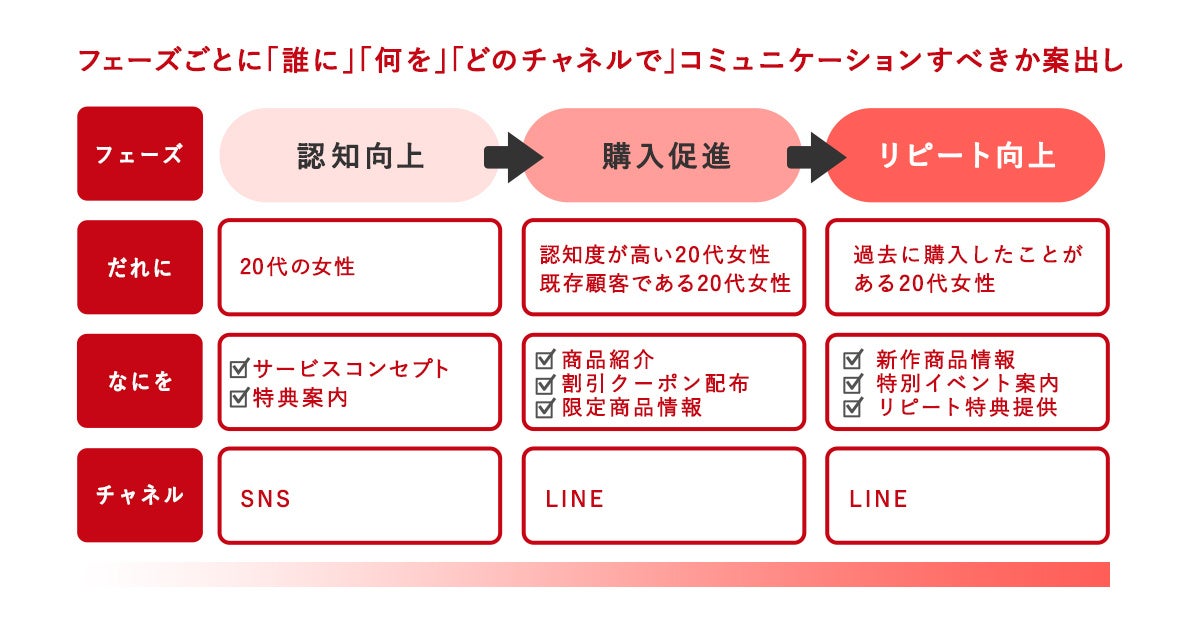 メールやLINEにおける顧客セグメントのフェーズに合わせた、コミュニケーションシナリオの立案を支援いたします。デジタルシフト社のこれまでの支援実績を基に、施策の目的、ターゲット、商品情報などをはじめとするマーケティング戦略に関わる要件を整理し、各種チャネルの特徴をChatGPTに反映いたします。その結果、従来の7分の1の時間に短縮して、シナリオを作成することが可能です。