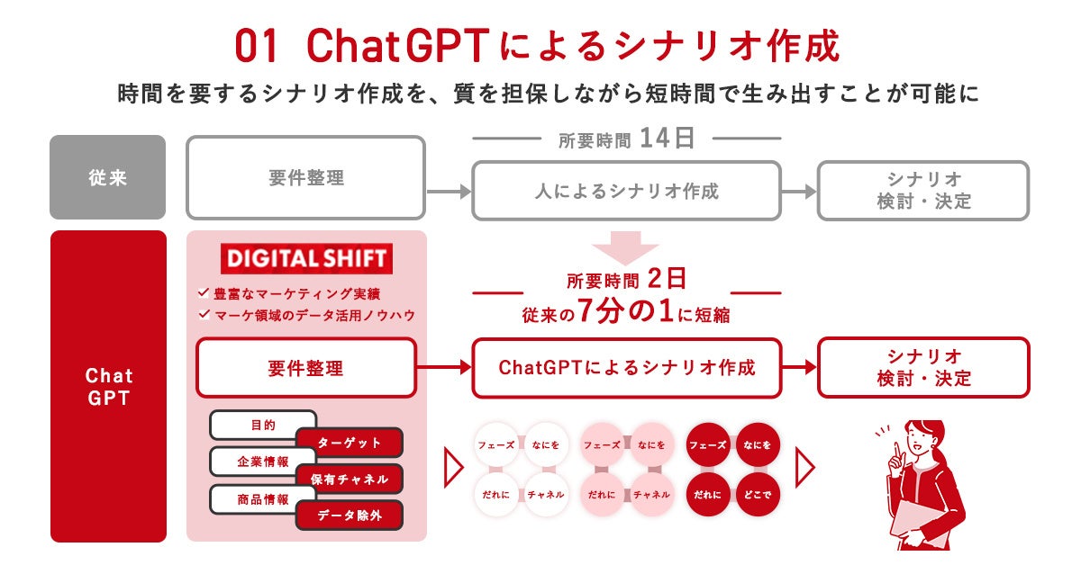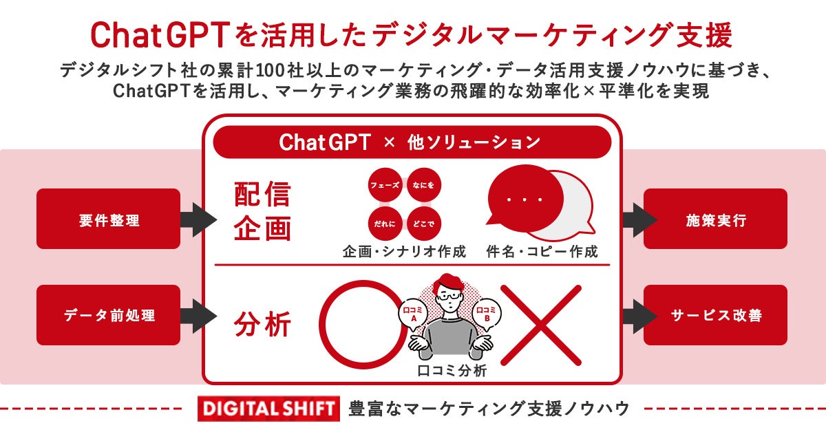 日本全国の企業のデジタルシフトの実現を支援する、株式会社デジタルシフト(本社:東京都千代田区、代表取締役社長:吉田 康祐、以下、デジタルシフト社)は、株式会社オプト(本社:東京都千代田区、代表取締役社長 CEO:栗本 聖也、以下、オプト社)と連携し、ChatGPT(※1)をはじめとする生成AIを活用したデジタルマーケティングを支援するAIイノベーション推進室を、本年8月1日(火)に設立したことをお知らせいたします。