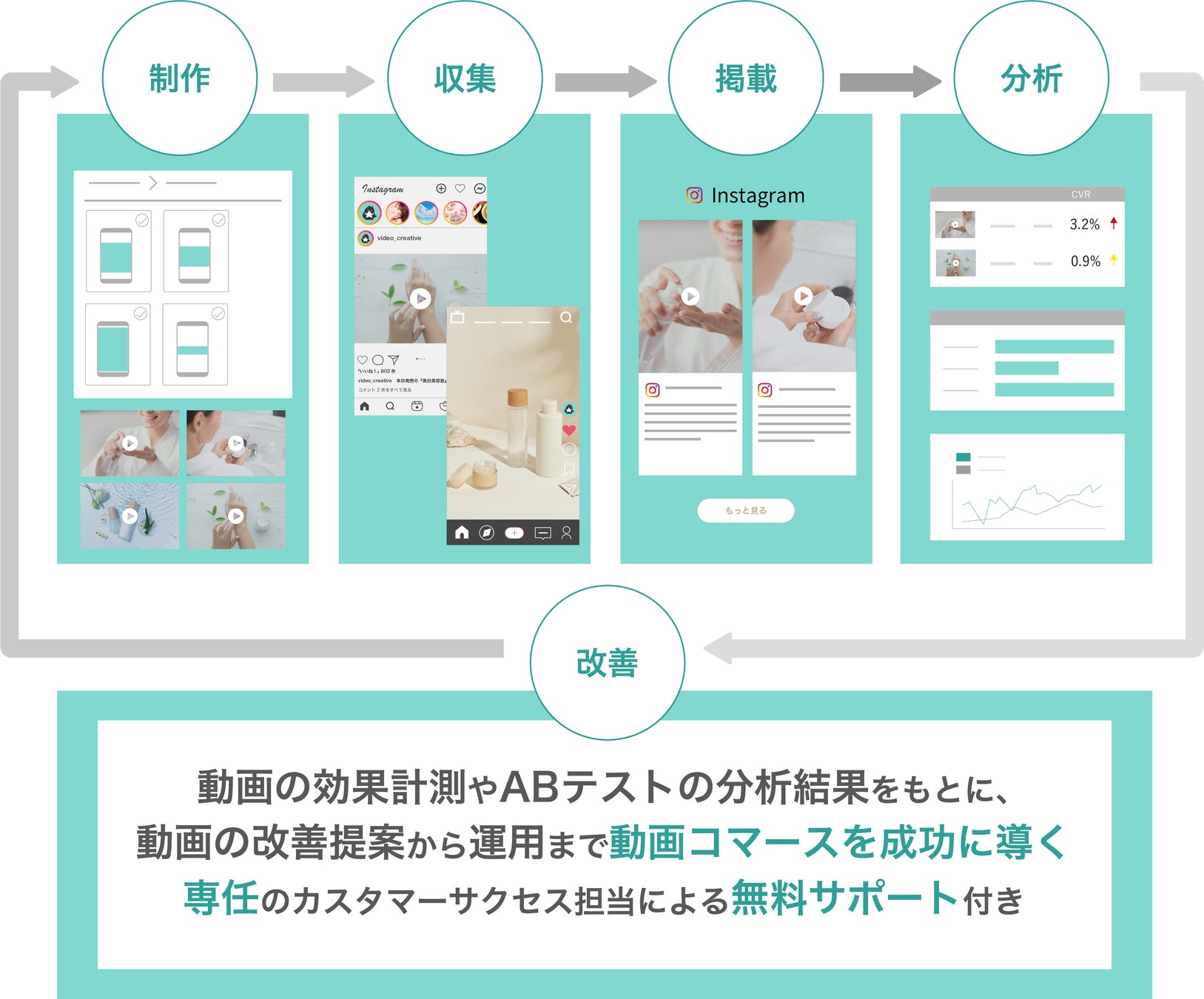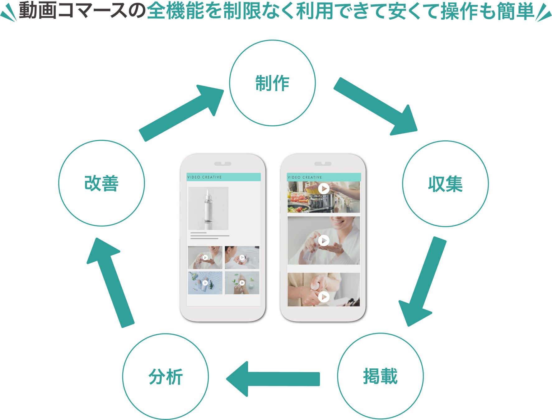 社内に動画を制作するリソースがない企業様、動画をLPやECサイトにただ貼りつける(埋め込む)だけで動画コマースの分析(動画視聴率、CVR)をしていない企業様など、「VIDEOクリエイティブ」を使えば、自社ECサイトやLPなどのあらゆる箇所に動画を簡単に掲載し、分析し、その分析結果をもとに改善するまでの「運用型動画コマース(=動画制作⇒収集⇒掲載⇒分析⇒改善)」を一気通貫で自動化させることが可能です。