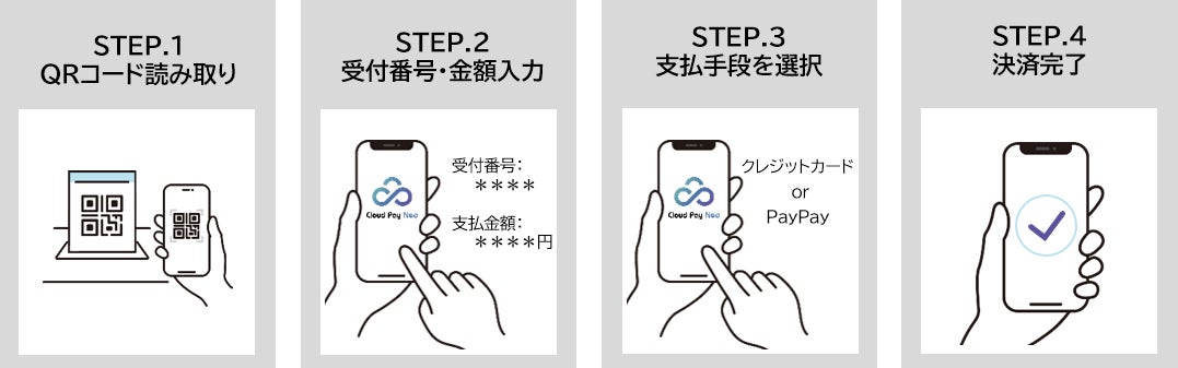 「CloudPay Neo」は、QRコードの読み取りでクレジットカードや各種ID決済(アカウント決済)*3の支払いができる端末レスのキャッシュレス決済サービスです。消費者はスマートフォンでQRコードを読み取り、表示される支払画面に注文情報を入力します。その後、希望する決済手段を選択して支払いを完了します。