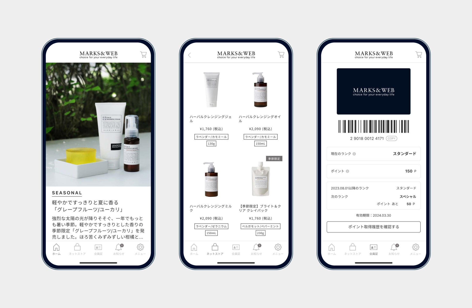 MARKS&WEBは、フェイスケア・ヘアケア・ボディケアなどの自然派化粧品や生活雑貨を取り扱うブランドで、国内79店舗とネットストアで販売をしています。MARKS&WEBはこれまで、店舗とネットストアの双方で使えるポイントサービスを提供し、定期的な一斉配信のメールマガジンを通じてお客さまへのご案内を行ってきました。ブランドをご愛用いただくお客さまが多くいる中で、従来のポイント制度はもとより、「顧客情報を正確に取得することでお客さまの理解を深めたい・その上で、今の時代にあわせてお客さまに向けた情報提供や発信を進めることでファンを増やしたい」といった課題感がありました。