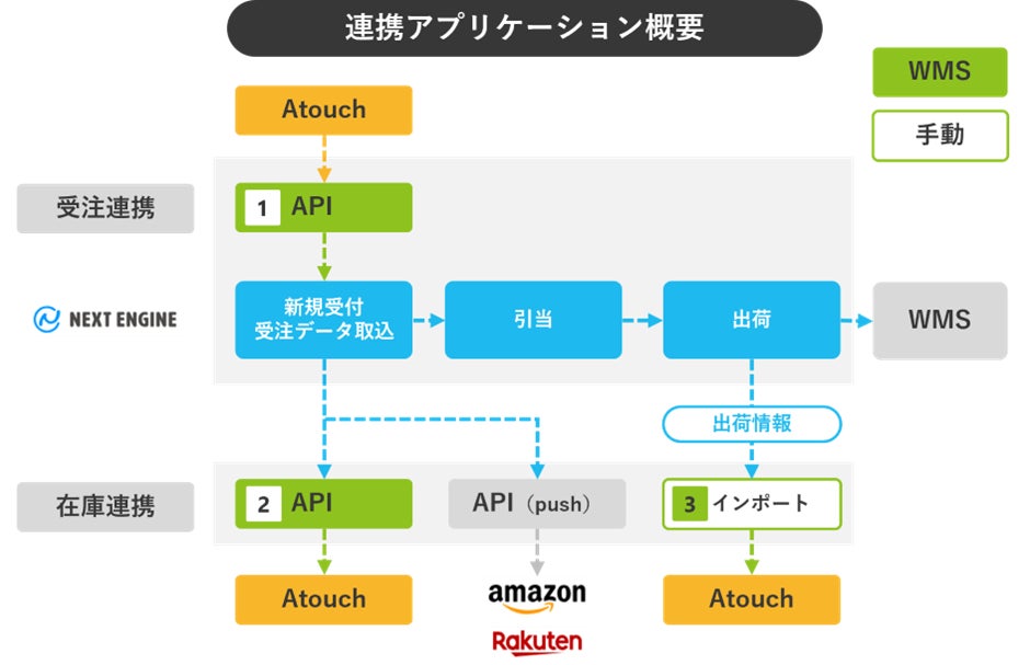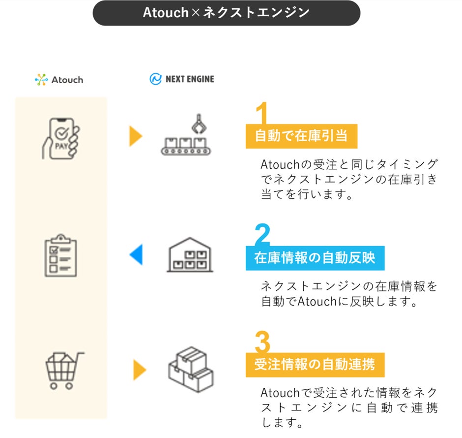 今回の「ネクストエンジン連携機能」により、「Atouch」と「ネクストエンジン」の間で受注データの一部が自動連携されます。これによりモール型・カート型を問わず複数のECサイトの受注データを一元管理することが可能です。