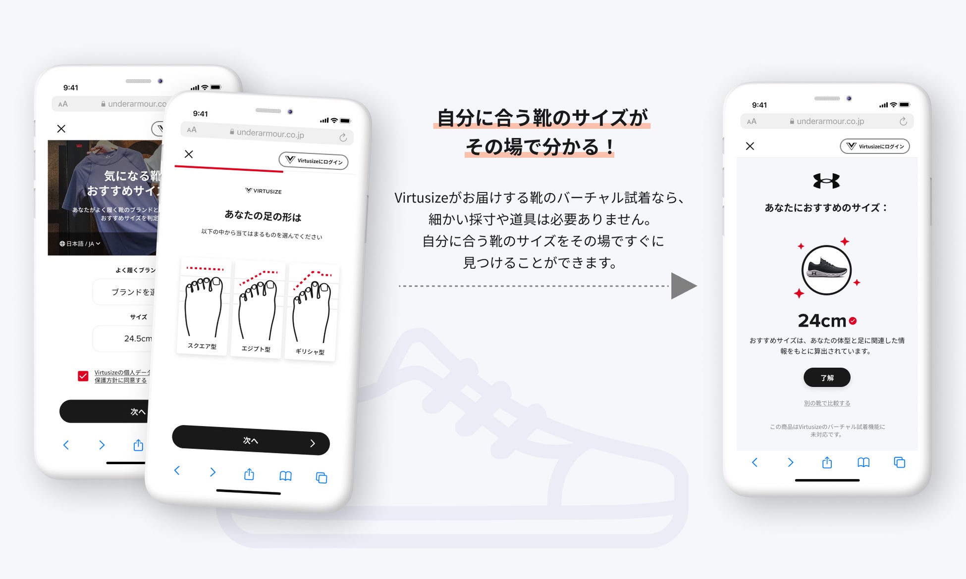 株式会社Virtusize(代表取締役:上野オラウソン・アンドレアス、本社:東京都港区、以下 Virtusize)は、簡単な入力ステップのみでおすすめの靴のサイズを知ることができる靴に特化したオンラン試着サービスを開発致しました。サービス開始に伴い、ローンチパートナーとして、株式会社ドーム(代表取締役CEO:北島 義典、本社:東京都江東区、以下 ドーム)が運営するアンダーアーマー公式サイトへサービス提供を開始致しました。