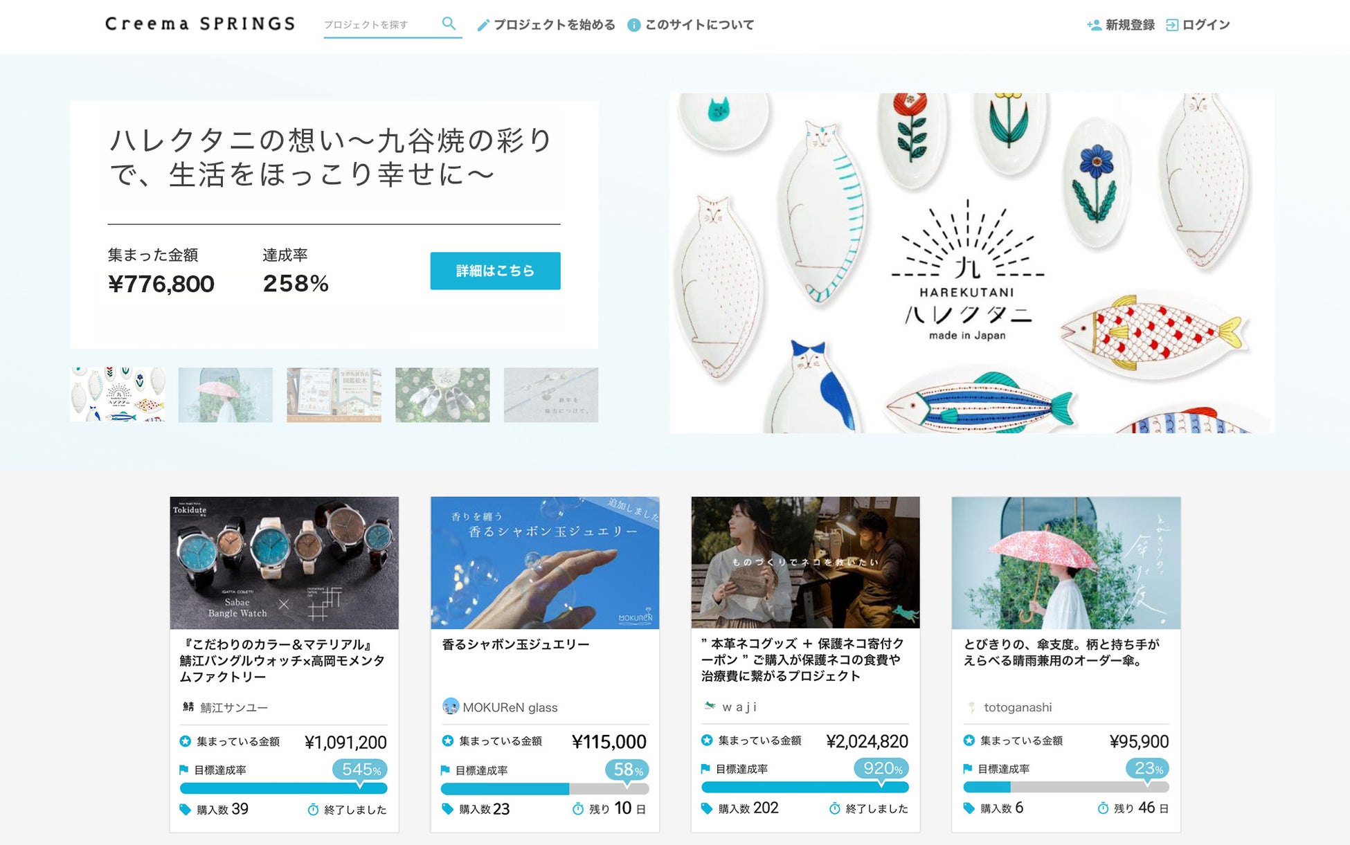 Creema SPRINGSは、全国25万人のクリエイターによる1,600万点の作品が出品され、流通総額約170億円となる、日本最大のハンドメイドマーケットプレイス「Creema」と連携するクラウドファンディングサービスです。