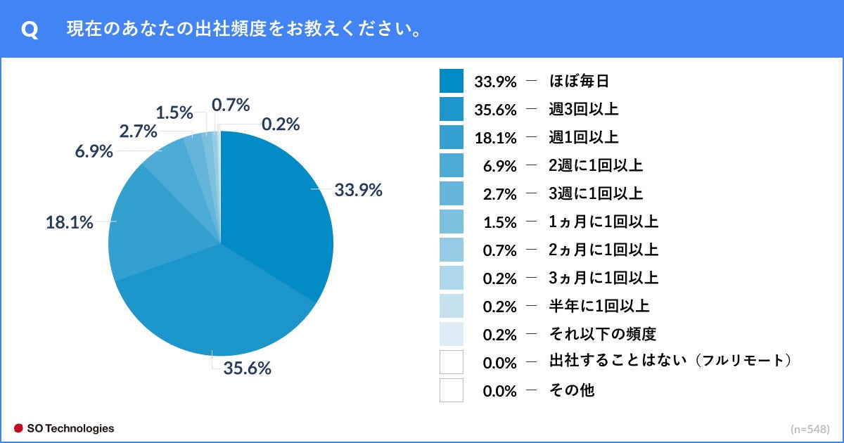 一方、回答者の所属する企業としての出社方針では、「原則、毎日出社」が32.8%、「週に2度以上の出社が必須」が38.5%、「週に1度は出社が必須」が17.0%と、計88.3%が週1回以上の出社を求めていることもわかった。(n=548)