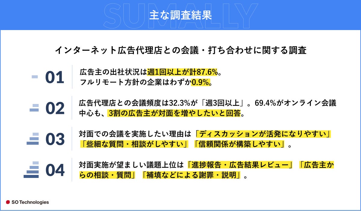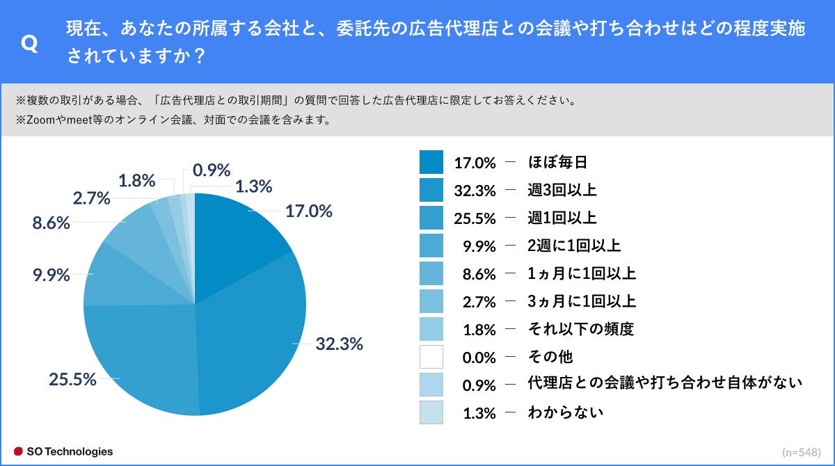 ソウルドアウト株式会社(本社:東京都文京区 代表取締役社長CEO兼CCO:荒波 修)の連結子会社であり、マーケティングテクノロジーの力で地域活性化を推進するSO Technologies株式会社(本社:東京都文京区 代表取締役:荒木 央、以下「当社」)は、インターネット広告を広告代理店に委託している広告主548人(※)を対象に、「インターネット広告代理店との会議・打ち合わせに関する調査」を実施しました。